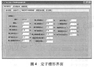 同時輔以實時刷新技術(shù),使槽形顯示與設計者的槽形參數(shù)輸入保持同步。只要任何一槽形數(shù)據(jù)發(fā)生變化,實時顯示的槽形就會相應變化。當槽形數(shù)據(jù)出錯時,軟件提供對話框提醒設計人員,從而確保及時發(fā)現(xiàn)設計的參數(shù)設置錯誤,起到一定的監(jiān)測功能。設計人員也能根據(jù)顯示的槽形進行經(jīng)驗判斷,迅速發(fā)現(xiàn)不合理數(shù)據(jù),減少設計不合理性,節(jié)約大量資源。變化槽形各部分尺寸的選擇和計算通過Visual c++6.0編程,以圖4的界面形式顯示。