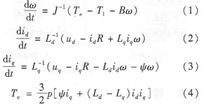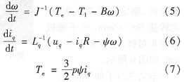 式中:ud、uq、id、iq、Ld、Lq分別為定子dq軸電壓、電流和電感,R為定子繞組電阻,ω為轉(zhuǎn)子角速度,J為運(yùn)動部分的慣量,B為粘滯摩擦因數(shù),Te為電磁轉(zhuǎn)矩,T1為負(fù)載轉(zhuǎn)矩,ψ為永磁磁鏈,p為極對數(shù)。