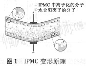 IPMc的致動機理如圖l所示。在兩電極上施加電壓后,材料中本來平均分布的陽離子在外加電場的作用下向陰極聚集。同時膜內(nèi)陽離子(Na、Li)等親水性很強,它們移動時,帶動水分子一起移動到了陰極附近,從而在膜的一側形成一個很薄(小于10μm)的邊界層,IPMc膜負極側溶脹,產(chǎn)生壓力差,密度大的地方向密度小的地方彎曲,即膜向陽極彎曲,從而導致形變。