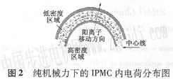 反之,膜受外力而變形,將在電極間產(chǎn)生電勢差。這是因為膜的變形使膜內(nèi)外部的纖維膨脹,內(nèi)部的壓縮(如圖2所示),這就導致膜的纖維內(nèi)產(chǎn)生應力梯度。又因為膜內(nèi)的陰離子固定在聚合物內(nèi)的纖維中不能自由移動,而陽離子是可以移動的,所以膜內(nèi)的陽離子朝密度小的區(qū)域運動,使電極間產(chǎn)生電勢差。IPMc的這種傳感性能最早是由sadeghipour等人提出的,后來shahinp00r進行了深入的研究,并取得了一定的成果。這種特性使得IPMc在MEMs中有著巨大的發(fā)展?jié)摿Α?/DIV>