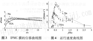 膜內(nèi)陽離子種類對膜的位移量影響也很大,因為離子不同,膜的內(nèi)阻和膜的硬度也不同,這些因素都會導致膜的致動性不同。例如Masaki Yamakita的蛇形作動器用不同的離子(Na、cs、TEA)進行位移和速度的對比,如圖3、圖4所示。