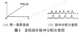 直線插補的脈沖分配如圖1所示。設(shè)一直線OP,起點在坐標(biāo)原點0(0,0),終點為P(Xp,Yp)。對OP插補較理想的脈沖分配是:x軸分配xp。個脈沖,Y軸分配Yp個脈沖;x軸相鄰脈沖的時間間隔為a,Y軸相鄰脈沖的時間間隔為b,且滿足aXp=6Yp。如果以脈沖密度高的軸為基準,在該軸整個進給脈沖期間,逐次判斷其相對的另一軸脈沖是否存在,以判斷是否進給,即可實現(xiàn)上述脈沖分配。