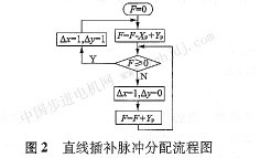 直線插補脈沖分配流程如圖2所示,其中F為偏差判別函數(shù)[1],F(xiàn)=F—Xp+Yp;令起始點在直線上,則F=0。△x=1表示向x軸進給一步,△x=0表示x軸不進給,Y軸同理。進給過程中Xp、Yp保持不變。假設(shè)Xp>Yp,則a<b,即x軸脈沖密度高,則以x軸脈沖為基準,在x軸整個進給脈沖間,根據(jù)偏差判別函數(shù)F,逐次判斷其相對的Y軸脈沖是否存在,直到到達終點,插補結(jié)束。