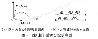 以點P(A。,-B。)為圓心的順時針方向的圓弧為例,P點是圓弧起點0的切線終點,P點的坐標(biāo)為(B。,A。),圓弧插補脈沖分配如圖3所示。