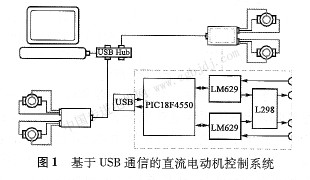 中圈分類號:TM33 文獻標識碼:A 文章編號:1004—7018(2008)06—0040—02  本文利用USB的可拓展性開發(fā)可以按照需要擴增和縮減的直流電動機計算機分級控制系統(tǒng)。系統(tǒng)中將一臺個人計算機作為USB系統(tǒng)中的主機。通過USB數(shù)據(jù)傳遞控制一塊或多塊驅(qū)動一執(zhí)行模塊,如圖1所示。每個模塊含有一片PICl8F4550單片機、兩片LM629直流電動機專用控制芯片、一片L298驅(qū)動芯片、兩臺帶有同軸光電碼盤的直流電動機。其中PICl8F4550單片機是USB系統(tǒng)中的關鍵節(jié)點。圖1中的USB Hub部件為USB集線器(擴展USB的聯(lián)接端口)。