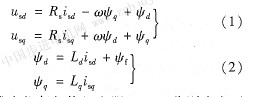 永磁同步發(fā)電機在由同步旋轉(zhuǎn)坐標系中的數(shù)學模型[3]為: