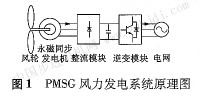 PMSG風力發(fā)電系統(tǒng)如圖1所示。永磁同步發(fā)電機直接與風輪機相連接,再通過全功率控制的變-直-交電路連接到電網(wǎng)上,功率變換電路由整流器、直流電路環(huán)節(jié)、逆變器組成。發(fā)電機首先將風能轉(zhuǎn)化為頻率和幅值變化的交流電,經(jīng)過整流之后變?yōu)橹绷,然后?jīng)過三相逆變器變換為三相電壓和頻率均恒定的交流電傳遞到電網(wǎng)。