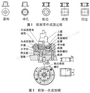 由于工件小,又薄又軟的鋁皮厚度僅為O 15—0 35 mm,操作時(shí)如定位,取件不當(dāng)也會(huì)損傷零件而造成廢口,所以要緊縮工序以提高生產(chǎn)效率和保證零件的質(zhì)量尤為重要。圖l為框架零件的成型過(guò)程。即撐方、鼓形、整形,原來(lái)需要三副模具來(lái)完成,相當(dāng)繁鎖,后經(jīng)我們?cè)趯?shí)際操作中反復(fù)試驗(yàn)僅用一副模具來(lái)完成,其結(jié)構(gòu)如圖2所示。