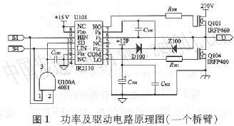 將三相115 V(Ac)整流后,直流負(fù)載電壓在270 V左右。對(duì)于控制器基本輸出功率指標(biāo),可以算出額定電流為2 O00/270=7.4 A。功率器件選用了 MOsFET功率管IRFP460,該器件耐壓V=500V,持續(xù)工作電流,ID=13 A(100℃)。從參數(shù)上應(yīng)能滿足工作要求。功率驅(qū)動(dòng)Ic選用上管自舉的IR2110,V=500V,I=2 A。為防止負(fù)過(guò)沖可能引起輸出鎖定導(dǎo)致直通故障,在V間加TVs(P6KEl8A),同時(shí)由于IR2110沒(méi)有輸入互鎖,因而在輸入端增加與門(mén)防止輸入信號(hào)同時(shí)為高而導(dǎo)致直通。電機(jī)為單向旋轉(zhuǎn),我們?yōu)闇p小開(kāi)關(guān)損耗將斬波方式選為下斬上不斬,這也能有效防止泵升。