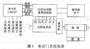 電動(dòng)門(mén)系統(tǒng)由外部信號(hào)、單片機(jī)、無(wú)刷電動(dòng)機(jī)及其通用控制器、減速機(jī)、滾筒、蓄電池等部分構(gòu)成,系統(tǒng)框圖如圖l所示。