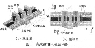 電機(jī)包含三個(gè)線圈。每個(gè)線圈都是經(jīng)螺絲固定在運(yùn)動(dòng)平臺(tái)上;每個(gè)線圈相差120 。的電氣角度。該結(jié)構(gòu)可以使得各個(gè)相之間的互感達(dá)到最小 [2]。為了保證較大水平力的輸出,運(yùn)動(dòng)平臺(tái)和定子齒之間的空氣隙固定在0.2mm。由于通電后動(dòng)定子之間的吸引力很大,為使得運(yùn)動(dòng)期間的機(jī)械結(jié)構(gòu)穩(wěn)固,每隔一定距離,硅鋼片疊片都被鉚釘鎖緊;定子的硅鋼片被夾桿固定在定子基座上。圖1為直線磁阻電機(jī)的整體構(gòu)造圖。