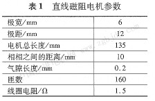 該直線磁阻電機(jī)包含一個(gè)運(yùn)動(dòng)平臺(tái),一組直線導(dǎo)軌,疊片式的硅鋼片固定在定子基座內(nèi)。運(yùn)動(dòng)平臺(tái)和定子基座的材料都是金屬鋁,降低動(dòng)子和定子基座的質(zhì)量。疊片結(jié)構(gòu)是由0.5 mm厚的硅鋼片構(gòu)成,動(dòng)、定子分別疊加50片。表1為電機(jī)機(jī)械和電氣參數(shù)。