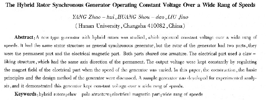 摘要:研究了一種寬轉(zhuǎn)速范圍內(nèi)穩(wěn)壓的組合轉(zhuǎn)子同步發(fā)電機(jī)。該發(fā)電機(jī)的定子結(jié)構(gòu)與普通發(fā)電機(jī)相同,轉(zhuǎn)子由起主發(fā)電用的永磁部分和調(diào)壓用的電勵磁部分組成,他們同軸安裝,共用同一套電樞繞組。電勵磁部分采用內(nèi)勵磁無刷爪板結(jié)構(gòu),通過調(diào)節(jié)其勵磁電流來改變氣隙磁通大小,從而達(dá)到穩(wěn)壓目的。對電機(jī)的結(jié)構(gòu)特點(diǎn)、運(yùn)行原理和電磁設(shè)計(jì)進(jìn)行了分析。樣機(jī)實(shí)驗(yàn)分析證明了該種電機(jī)在寬轉(zhuǎn)速變化范圍內(nèi)穩(wěn)壓性良好的特點(diǎn)。