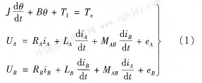 步進電動機的仿真模型可歸結為兩相繞組回路的電壓方程和轉子的運動方程: