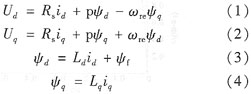 永磁同步電動(dòng)機(jī)在d—q坐標(biāo)系(轉(zhuǎn)子旋轉(zhuǎn)坐標(biāo)系)下的電壓和磁鏈方程為: