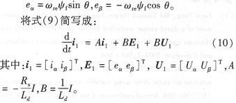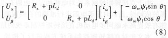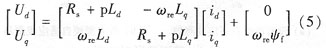 式中:p為微分算子;R為定子電阻;ω為轉(zhuǎn)子角速度;ψf為永磁體產(chǎn)生的磁鏈;Ld、Lq、ψd、ψq、id、iq、Ud、Uq分別為電感、磁鏈、電流、定子電壓在d、q軸上的分量。將式(3)、式(4)代人式(1)、式(2)得電壓矩陣方程: