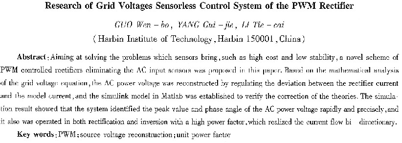 摘要:針對由傳感器帶來的高成本、低穩(wěn)定性等諸多缺點,提出一種無網(wǎng)側(cè)電動勢傳感器的PWM可控整流控制策略。在對三相電網(wǎng)電動勢方程分析的基礎上,利用交流電流偏差調(diào)節(jié)法重構(gòu)了網(wǎng)側(cè)電動勢的幅值和相角,建立了PWM可控整流的Matlab仿真模型驗證理論的正確性。仿真結(jié)果表明,該系統(tǒng)能夠迅速準確地辯識出電網(wǎng)電動勢,并且能夠以單位功率因數(shù)運行于整流和逆變,實現(xiàn)了能量的雙向傳輸。