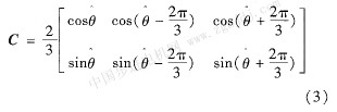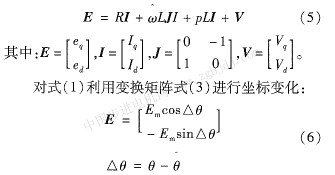 式中:i是整流器的輸入電流,v是輸入電壓。引入基于估計相角θ的坐標變換,代表估計值,變換矩陣為: