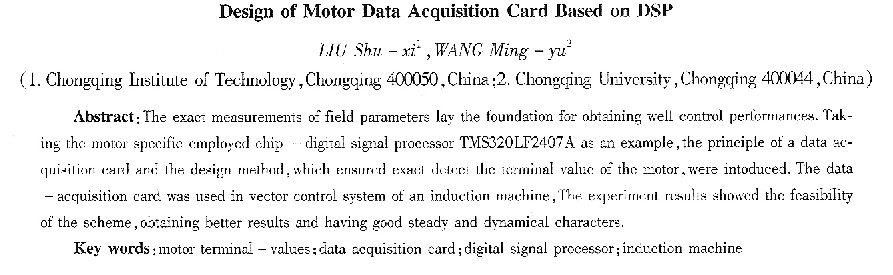 本文以德州儀器數(shù)字信號處理器TMs320LF2407A在高性能交流電機調速控制中的應用為例,討論了在確保電機控制性能的前提下與之相關的對不同類型、不同物理屬性的電機運行參量進行測量的方法,主要是各種模擬量和開關量的檢測及其輸入通道設計方法以及與處理器的接口技術等。數(shù)字信號處理器根據(jù)測量結果對交流電機進行控制或者保護,最后將設計的電機端量數(shù)據(jù)采集卡用于感應電機的矢量控制系統(tǒng)中進行實驗,結果表明該數(shù)據(jù)卡設計是可行的,可以獲得良好的電機控制性能。而且,這種基于電機參數(shù)數(shù)據(jù)采集卡的設計模式,使得應用平臺對系統(tǒng)的控制和檢測非常靈活,可用于大部分電機和電源的控制策略。