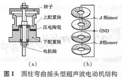 圓柱彎曲型超聲波電動機(jī)的結(jié)構(gòu)如圖l所示。它主要由轉(zhuǎn)子、圓柱定子和軸組成。其中定子由上配重塊和下配重塊通過螺栓將壓電陶瓷片組壓緊形成蘭杰文振子。壓電陶瓷片的極化方式和布局如圖lb所示。當(dāng)在A、B兩組壓電陶瓷片上施加相位差為90o的同頻交流電壓時,由于壓電陶瓷的逆壓電效應(yīng),在定子上激勵出兩個在時間上和空間上相差90o的一階彎曲振動模態(tài),疊加這兩個彎曲振動模態(tài),將在定子頂端面形成一行波,行波行進(jìn)時使得定子頂端面上的任一質(zhì)點(diǎn)作橢圓運(yùn)動。定子與轉(zhuǎn)子相接觸的點(diǎn)對轉(zhuǎn)子產(chǎn)生沿圓周的切向摩擦力,從而驅(qū)動壓在其上的轉(zhuǎn)子旋轉(zhuǎn)。