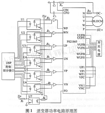 圖1是逆變器功率電路原理圖,由于DsP是弱電部分,工作電壓僅為5 V,而盡管IPM的輸入信號與DsP的電平兼容,但是為了保護DsP以及弱電電路,在DSP和IPM之間使用了光電耦合器實現電氣隔離。本設計必須使用高速光電耦合器才能滿足驅動信號變化迅速的要求,在此使用的是6N136,即圖中的ul~u6。而故障輸出則可以采用通用光電耦合器如Pc817,以降低成本。在圖1中,由于Ps21865輸入信號自帶有下拉電阻,因此在6N136后又接一級緩沖電路(采用集成總線緩沖器74Hc244)來驅動IPM模塊工作。R10作為母線采樣電阻,采集母線電流,經過由C1、R9構成的低通濾波器送人PS21865。c2控制故障輸出的低電平寬度,一般取值為2.2 nF,對應的時間為1.8 ms。
