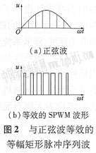 sPwM逆變器,即期望其輸出電壓是純粹的正弦波形,那么,可以把一個正弦半波分成N等分,如圖2所示,然后把每一等分的正弦曲線與橫軸所包圍的面積都用一個與此面積相等的等高矩形脈沖來代替,矩形脈沖的中點與正弦波每一等分的中點重合。這樣,由N個等幅而不等寬的矩形脈沖所組成的波形就與正弦的半周等效。同樣,正弦波的負半周也可用相同的方法來等效。