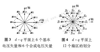 依此類推,可得u23、u34、u56、u61,如圖3所示。為便于選擇這12個電壓矢量,將d—q平面劃分為12個扇區(qū),每個扇區(qū)的范圍為30。,分別用s1~s12表示,如圖4所示。