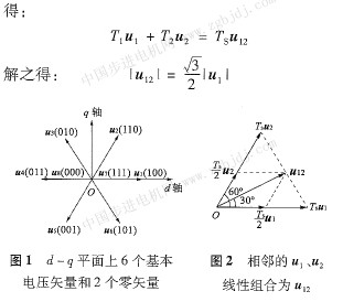 三相電壓型逆變器的8種基本開關狀態(tài),被映射到機電能量轉(zhuǎn)換平面(d-q平面)上,即為6個基本電壓矢量和2個零矢量。傳統(tǒng)的三相異步電動機直接轉(zhuǎn)矩控制系統(tǒng)在每個控制周期內(nèi)選擇8個矢量中的某一個,去控制逆變器和異步電機,從而將定子磁鏈和轉(zhuǎn)矩控制在相應的滯環(huán)帶內(nèi)。由于電壓矢量的個數(shù)有限,并且在d—q平面上的分布不連續(xù),位置互差60。,因此不可避免地導致磁鏈、轉(zhuǎn)矩的脈動較大,電流諧波較大,使電機產(chǎn)生不希望的噪聲和振動。為了解決這一問題,本文采用SVPWM的方法對6個基本電壓矢量進行線性組合,得到6個合成電壓矢量:然后在此基礎上,優(yōu)化設計出一種直接轉(zhuǎn)矩控制系統(tǒng)。最后在MATLAB/SIMULINK環(huán)境下建立該系統(tǒng)的仿真模型,并進行仿真實驗驗證。