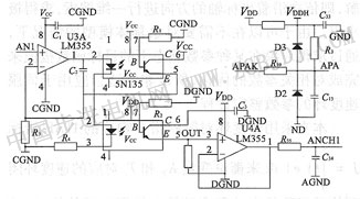 霍爾元件安裝在電機(jī)內(nèi)部檢測(cè)轉(zhuǎn)子磁極位置霍爾信號(hào)PA、PB、PC分別與DSP的三個(gè)模擬引腳相連將模擬引腳設(shè)置為數(shù)字接口通過(guò)產(chǎn)生PWM中斷來(lái)決定換向。DSP通過(guò)PWM引腳經(jīng)驅(qū)動(dòng)電路(本系統(tǒng)選用IR2130)連接到六個(gè)關(guān)管實(shí)現(xiàn)定頻PWM和換向控制。設(shè)計(jì)有三路模擬量的輸入分別是給定位置信號(hào)、電機(jī)實(shí)際位置反饋信號(hào)、電源電壓檢測(cè)信號(hào)模擬量的輸入分別經(jīng)過(guò)隔離以及濾波送至DSP。此外還外接有兩個(gè)指示燈來(lái)指示系統(tǒng)的運(yùn)行狀態(tài)。圖2只給出了一路模擬量與霍爾信號(hào)的輸入圖。