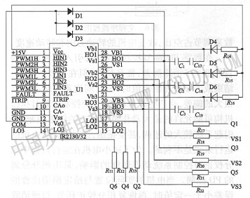 如圖3所示驅(qū)動(dòng)芯片選用IR公司的1R2130芯片同時(shí)控制六個(gè)大功率管的導(dǎo)通和關(guān)斷驅(qū)動(dòng)電路非常簡(jiǎn)單。是通過(guò)1-LM7815穩(wěn)壓器得到的﹢15 V電源。C1是自舉電容為上橋臂功率管驅(qū)動(dòng)的懸浮電源存儲(chǔ)能量D4的作用防止上橋臂導(dǎo)通時(shí)