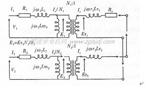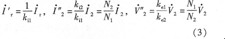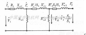圖3折算后的等效電路 圖中,R1、R1’、和R2’’:分別表示功率繞組、轉(zhuǎn)子和控制繞組的每相電阻;Xσ1、Xσr’、Xσ2’’分別為功率繞組、轉(zhuǎn)子和控制繞組的每相漏抗;Xm1 和Xm2’’,分別為功率繞組和控制繞組的每相激磁電抗。各參數(shù)均為頻率折算和繞組折算以后的值。轉(zhuǎn)子電阻和電抗折算到功率繞組的系數(shù)為Ke1和ki1,控制統(tǒng)組電阻和電抗折算到功率繞組的系數(shù)為Ke1ki1,/(ke2ki2);Ke1 、ki1分別為轉(zhuǎn)子折算到功率繞組的電壓比和電流比;ke2、ki2。分別為轉(zhuǎn)子折算到控制繞組的電壓比和電流比;i1、i2、i2’’分別為功率繞組、轉(zhuǎn)子回路和控制繞組中的電流; 分別表示功率繞組和控制繞組的相電壓。各電量均為考慮折算以后的值。折算值與實際值的關(guān)系為: