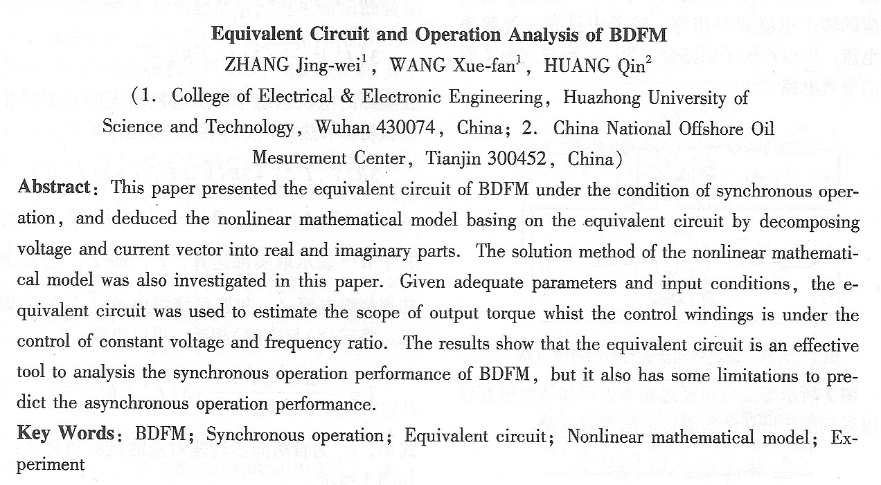 中圖分類號:TM36 文獻(xiàn)標(biāo)志碼:A 文章編號:1001-6848(2009) 12-0009-04 無刷雙饋電機(jī)等效電路及運行狀態(tài)分析 張經(jīng)緯,王雪帆,黃 琴 (1.華中科技大學(xué)電氣與電子工程學(xué)院,武漢430074 2.中國海洋石油總公司計量檢測中心,天津300452) 摘要:通過建立無刷雙饋電機(jī)( BDFM)同步運行時的等效電路,將各電量分解為實部和虛 部,推導(dǎo)了同步運行時的非線性數(shù)學(xué)方程,探討了方程的求解方法。在等效電路的基礎(chǔ)上,通過給定參數(shù)和輸入條件,計算無刷雙饋電機(jī)在控制繞組采用恒壓頻比控制方式下的輸出轉(zhuǎn)矩范圍。仿真和實驗結(jié)果證明,該等效電路能較好地反映無刷雙饋電機(jī)同步運行時的運行狀態(tài),為分析計算提供了有效的工具,但是不能反映失步的問題,因此具有一定的局限性。 關(guān)鍵詞:無刷雙饋電機(jī);同步運行;等效電路;非線性數(shù)學(xué)方程;實驗 0引言 無刷雙饋電機(jī)是在級聯(lián)式電機(jī)基礎(chǔ)上發(fā)展起來的一種新型電機(jī)。其定子上有兩套繞組,一套直接接到電網(wǎng),為功率繞組,另外一套通過雙向變頻器接到電網(wǎng),稱為控制繞組。當(dāng)無刷雙饋電機(jī)做電動運行時,通過調(diào)節(jié)控制繞組的頻率,可以實現(xiàn)準(zhǔn)確地調(diào)速,而且容易降低變頻器的容量和電壓等級;做發(fā)電機(jī)運行時,可以實現(xiàn)恒頻恒壓發(fā)電。此外由于取消了電刷裝置,結(jié)構(gòu)簡單,維護(hù)方便,因而在變速驅(qū)動( ASD)和恒頻恒壓發(fā)電(VSG)中有廣泛的應(yīng)用前景[1]。 1等效電路 無刷雙饋電機(jī)結(jié)構(gòu)示意圖如圖l所示。假設(shè)無刷雙饋電機(jī)功率繞組和控制繞組的極對數(shù)分別為p1,和p2,通人的電流頻率分別為f1和f2,并且具有相同的相序,則同步運行時,其轉(zhuǎn)速n滿足如下關(guān)系式[2]:  當(dāng)f2=0時,對應(yīng)的幾r稱為自然同步轉(zhuǎn)速。定義s1,和s2:分別為轉(zhuǎn)子相對于功率繞組和控制繞組的轉(zhuǎn)差率,定義s為控制繞組相對于功率繞組的相對轉(zhuǎn)差率,則式中