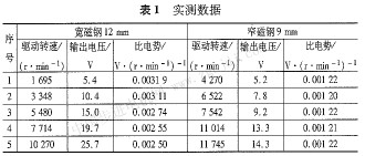 下面對一種45#機(jī)座小型永磁直流力矩電動機(jī)進(jìn)行實驗研究。原動機(jī)是一臺小型直流高速電動機(jī),需要驅(qū)動轉(zhuǎn)速10 OOO r/mm,為r便于驅(qū)動,驅(qū)動方式選為增速驅(qū)動,即原動機(jī)傳動輪用R=1 cm的力矩盤,發(fā)電機(jī)傳動輪則直接用電機(jī)軸代替,軸半徑R=O.4 cm,則傳動增速可達(dá)2.5倍。原動機(jī)與發(fā)電機(jī)分別裝夾在一種小型電磁測功器可動夾具上,因夾具自重,移動兩夾具距離,可以自動將拉線繃緊,由此實現(xiàn)平穩(wěn)傳動,簡單方便。表1是這種電機(jī)被驅(qū)動成發(fā)電機(jī)在不同轉(zhuǎn)速下比電勢變化情況的實測數(shù)據(jù)。