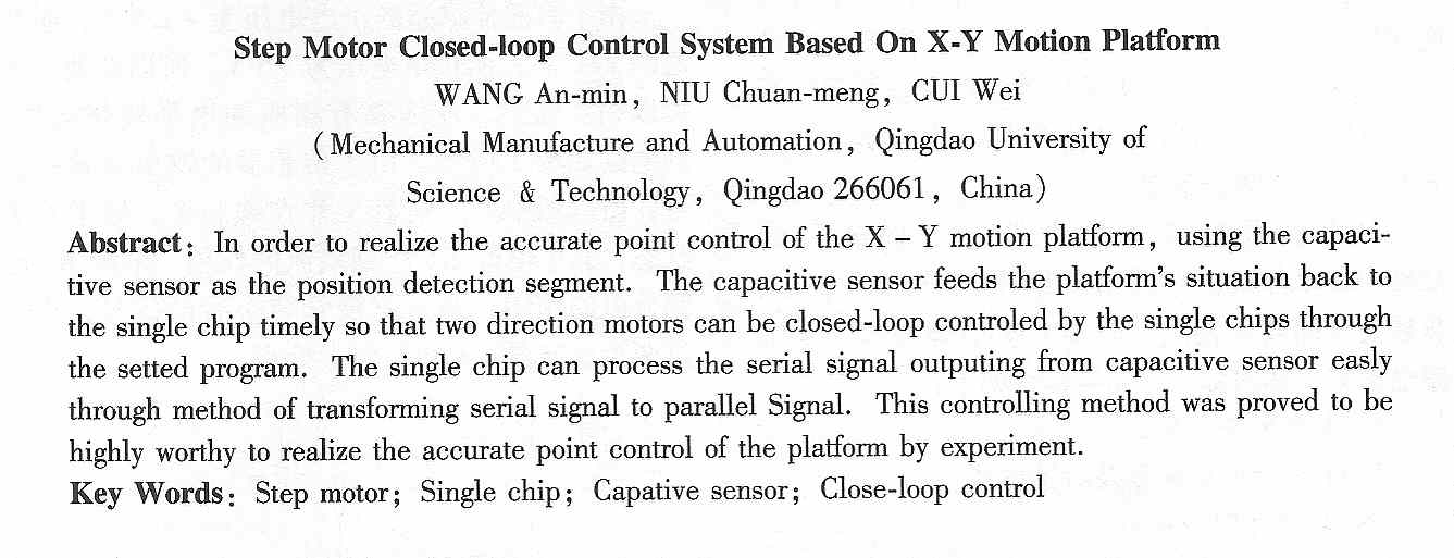 摘要:為實現(xiàn)X-Y二維工作平臺的精確定位,以容柵傳感器作為位置檢測環(huán)節(jié),實時的將工作臺的運動狀態(tài)反饋給單片機,單片機根據(jù)設(shè)定程序?qū)蓚方向的步進電機進行閉環(huán)控制。通過將容柵傳感器輸出的串行信號轉(zhuǎn)換成并行信號的方法,方便地實現(xiàn)了單片機對容柵傳感器輸出信號的處理。試驗證明,這種控制方法能實現(xiàn)工作平臺的精確定位,具有較高的實用價值。