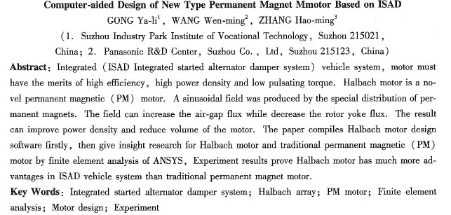 摘要:起動/助力/發(fā)電一體化系統(tǒng)汽車系統(tǒng)要求電機高效,高功率密度,低脈動轉(zhuǎn)矩。Hal—bach電機是一種新型永磁電機。獨特的永磁體結(jié)構(gòu)不僅使其磁極磁場呈正弦分布,而且還可以增加氣隙磁通密度,削弱轉(zhuǎn)子軛部磁通密度,這使得在提高電機的功率密度的同時,又可以減小電機的體積,提高電機的效率。首先編寫了Halbach電機和普通永磁同步電機設(shè)計軟件,然后利用ANSYS自帶語言編寫了兩種電機的有限元分析軟件,在此基礎(chǔ)上對所設(shè)計的Halbach電機和普通永磁電機進行了研究。樣機實驗數(shù)據(jù)證明Ha[bach電機在一體化系統(tǒng)中的優(yōu)越性。