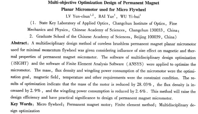 本文介紹了一種用于微小動(dòng)量飛輪的電磁型平面永磁微電機(jī);說(shuō)明了其結(jié)構(gòu)及工作原理。由于微電機(jī)作為微飛輪姿態(tài)控制系統(tǒng)的核心部件,是一個(gè)集機(jī)械、電子、電磁、自動(dòng)控制于一體的復(fù)雜系統(tǒng)。它其質(zhì)量、磁和熱性能直接影響系統(tǒng)的總體性能。因而對(duì)電機(jī)進(jìn)行優(yōu)化設(shè)計(jì)具有重要意義。