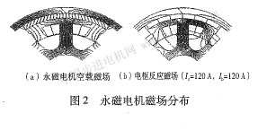 若定義A相定子齒和轉(zhuǎn)子齒完全重合時為22.5。,則轉(zhuǎn)子位置從0。轉(zhuǎn)到45。為一個周期。圖2(a)為B相定子齒與轉(zhuǎn)子齒重合時永磁電機空載時的1/4磁場分布圖。圖2(b)為無永磁體時永磁電機的1/4電樞反應(yīng)磁場分布圖。