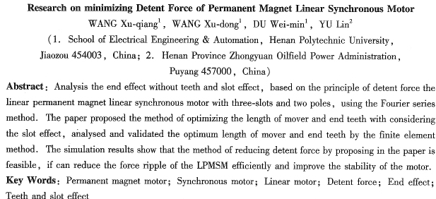 關(guān)鍵詞:永磁電機(jī);同步電機(jī);直線電機(jī);磁阻力;邊端效應(yīng);齒槽效應(yīng)