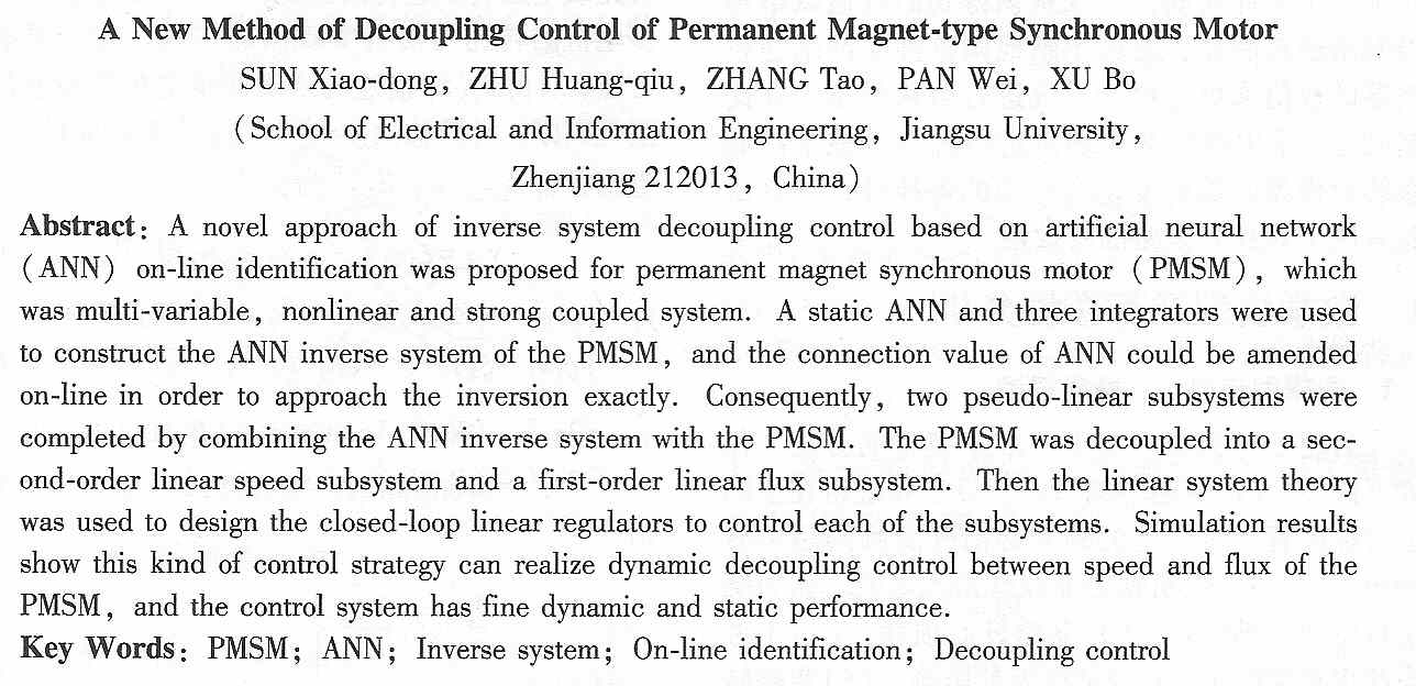 關(guān)鍵詞:永磁同步電機(jī);神經(jīng)網(wǎng)絡(luò);逆系統(tǒng);在線辨識(shí);解耦控制