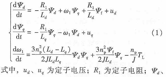 式中,uduq為定子電壓,R1為定子電阻,ψd、ψq為定子磁鏈,ψf為轉(zhuǎn)子永磁體磁鏈;Ld、Lq為定子自感,ω1為轉(zhuǎn)子角速度。