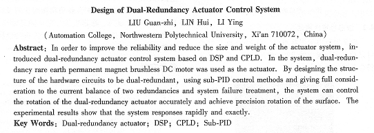 關(guān)鍵詞:雙余度舵機(jī);DSP;CPLD;分段PID