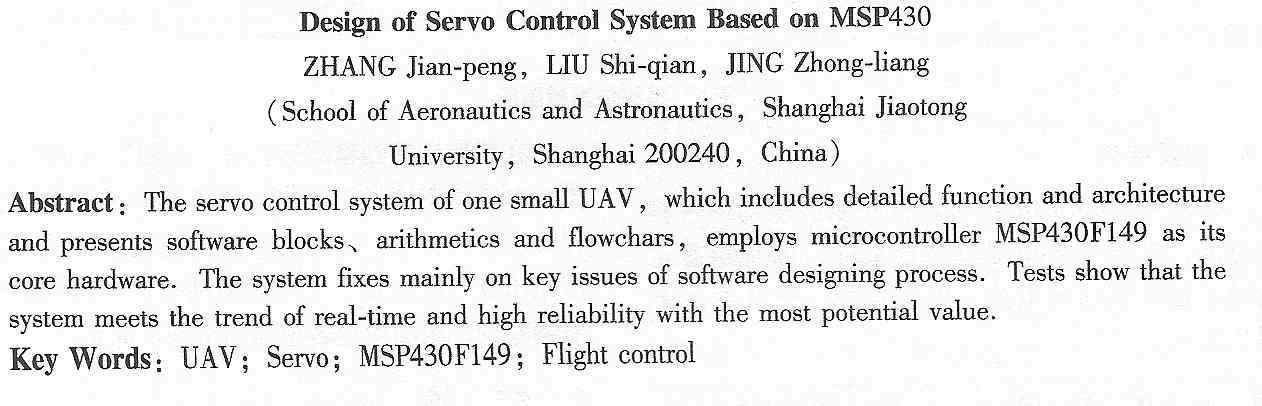 摘要:提出并實(shí)現(xiàn)了一種以MSP430F149單片機(jī)為硬件核心的某小型無人機(jī)舵機(jī)控制系統(tǒng)描述了系統(tǒng)的功能及硬件結(jié)構(gòu)配置,給出了實(shí)時(shí)控制軟件的功能模塊及算法和流程圖,并著重指出在軟件實(shí)現(xiàn)過程中應(yīng)注意的關(guān)鍵問題。實(shí)驗(yàn)結(jié)果表明此設(shè)計(jì)符合飛行控制器的實(shí)時(shí)性控制要求,可靠性高,具有廣泛的應(yīng)用價(jià)值。