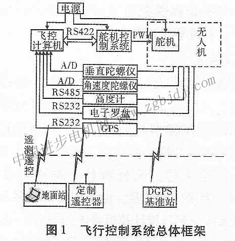 飛行控制系統(tǒng)總體框架如圖1所示,整個(gè)飛控系統(tǒng)是由飛控計(jì)算機(jī)、舵機(jī)控制系統(tǒng)、傳感器系統(tǒng)、GPS、機(jī)載電源及地面站系統(tǒng)組成。在飛行過程中,無人機(jī)一方面通過傳感器系統(tǒng)和GPS獲得飛行姿態(tài)和航向的實(shí)時(shí)參數(shù),并通過無線電傳回地面;另一方面隨時(shí)按收地面上傳的遙控指令。以這些信息為基礎(chǔ),經(jīng)過主控計(jì)算機(jī)控制律解算,按照一定協(xié)議輸出控制指令到舵機(jī)控制系統(tǒng)[5,6],再經(jīng)由舵機(jī)控制系統(tǒng)輸出相應(yīng)的信號控制舵機(jī)的偏轉(zhuǎn),從而實(shí)現(xiàn)對無人機(jī)飛行姿態(tài)的控制。
