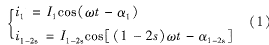 正常的籠型異步電動機(jī)的所有轉(zhuǎn)子導(dǎo)條均勻分布,當(dāng)出現(xiàn)斷條故障時,轉(zhuǎn)子電路結(jié)構(gòu)上的對稱性被破壞。定子外加三相對稱電壓時,定子三相基波電流會產(chǎn)生圓形旋轉(zhuǎn)磁勢F1。該磁勢建立的旋轉(zhuǎn)磁場將在轉(zhuǎn)子繞組中感應(yīng)頻率為曠的電勢和電流。當(dāng)轉(zhuǎn)子不對稱時,轉(zhuǎn)子繞組產(chǎn)生的磁勢為橢圓型,可以分解成相對于轉(zhuǎn)子的正轉(zhuǎn)分量F21和反轉(zhuǎn)分量F22F21與定子磁勢F,相對靜止,F(xiàn)22相對于定子坐標(biāo)系的轉(zhuǎn)速為(1—2s)ω,會在定子繞組中感應(yīng)出頻率為(1—2s)f的電流[1];ê(1-2s)f頻率的電流分量可分別表示為:
