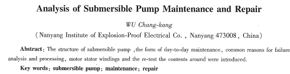 摘要:介紹了潛水電泵的結(jié)構(gòu)型式和正常維護(hù),并對(duì)其常見(jiàn)故障的原因進(jìn)行了分析與處理;敘述了電機(jī)定子繞組的重繞和試驗(yàn)內(nèi)容。
