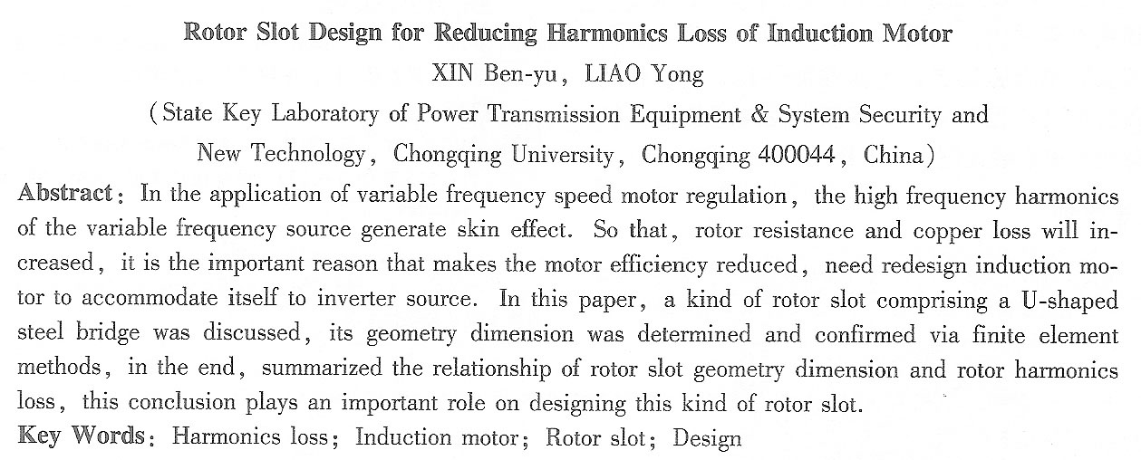 摘要:在變頻調(diào)速電機(jī)的應(yīng)用中,電源中的高次諧波電流將引起集膚效應(yīng),使轉(zhuǎn)子導(dǎo)條電阻及銅損耗增加,這是造成電機(jī)效率降低的根本原因,因此必須針對(duì)逆變器供電的特殊性設(shè)計(jì)異步電機(jī)。在對(duì)國(guó)外提出的一種帶U形鐵心橋的轉(zhuǎn)子槽進(jìn)行分析的基礎(chǔ)上得出確定其尺寸的表達(dá)式,并通過(guò)電磁場(chǎng)有限元分析來(lái)驗(yàn)證,結(jié)果表明,這種轉(zhuǎn)子槽能極大降低轉(zhuǎn)子諧波電流、轉(zhuǎn)子諧波損耗。最后,總結(jié)出轉(zhuǎn)子槽尺寸與轉(zhuǎn)子導(dǎo)條諧波損耗之間的變化規(guī)律,對(duì)以后設(shè)計(jì)該種轉(zhuǎn)子槽具有指導(dǎo)意義。