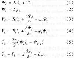 式中:Ψd、Ψq,id、iq,Vd、Vq分別為定子磁鏈、定子電流和定子電壓在d、q軸分量;Ld、Lq為定子繞組d、q、軸等效電感;Ψf為轉(zhuǎn)子磁鏈;Rs為定子繞組電阻;p為電機(jī)極對(duì)數(shù);ωr為轉(zhuǎn)子機(jī)械角速度,ω=npωr,ω為轉(zhuǎn)子電角速度;Te為電磁轉(zhuǎn)矩;TL為負(fù)載轉(zhuǎn)矩;B為阻尼系數(shù);,為電機(jī)轉(zhuǎn)動(dòng)慣量。