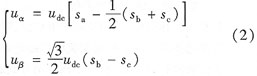 根據(jù)直流母線電壓和并網(wǎng)逆變器的開關(guān)狀態(tài)sa、sb、sc(si=1為相應(yīng)的上橋臂導(dǎo)通,si=0為相應(yīng)的下橋臂導(dǎo)通),可以估算出并網(wǎng)逆變器輸出的電壓uα、uβ(等匝數(shù)變換):