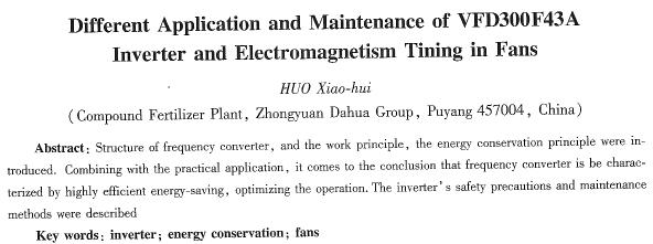摘要:介紹了VFD300F43A變頻器的工作原理,對(duì)電磁調(diào)速和變頻器調(diào)速進(jìn)行r對(duì)比分析。結(jié)合實(shí)際應(yīng)用,通過(guò)對(duì)熱引風(fēng)機(jī)進(jìn)行技術(shù)改造,得出使用變頻器具有很好的節(jié)能效果,同時(shí)可以優(yōu)化操作。敘述了變頻器的安全注意事項(xiàng)及維護(hù)保養(yǎng)方法。