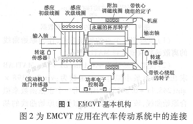 示意圖。發(fā)動機(IcE)連接EMcVT系統(tǒng)的輸入軸,輸出軸通過驅(qū)動橋與驅(qū)動輪連接。施加于勵磁線圈的直流勵磁功率只占發(fā)電電功率的很小部分,改變勵磁電流的大小與極性,就可調(diào)節(jié)杯形外轉(zhuǎn)子的磁場強度和轉(zhuǎn)速。